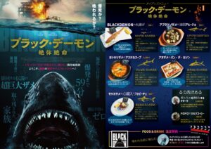 爆発寸前の油田を舞台に伝説の巨大ザメ“ブラック・デーモン”が家族を襲う……! というストーリー展開にちなんで、“5種類のサメ”を使ったコラボメニュー全7品を提供する。