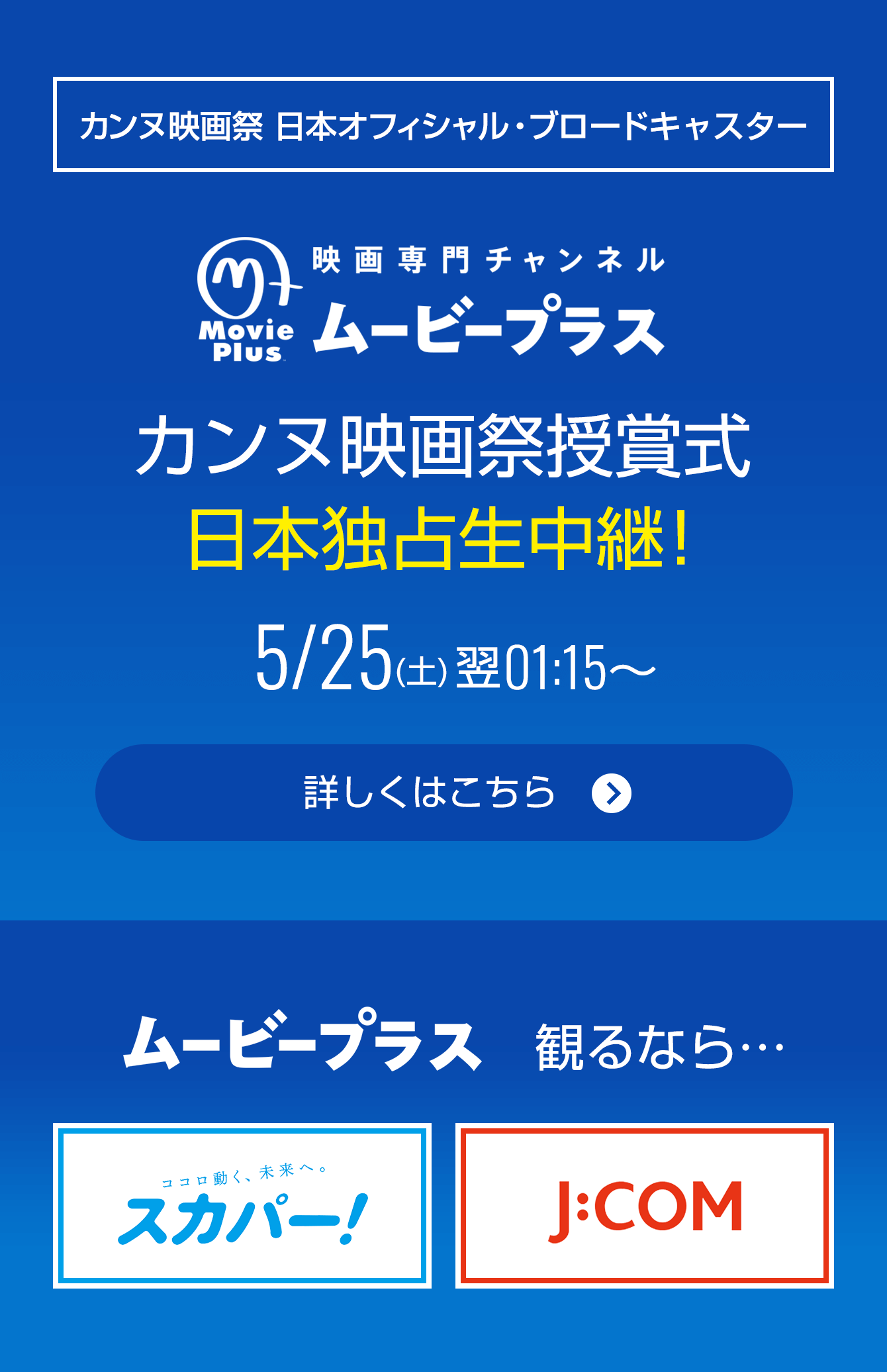 最高賞パルム・ドールの行方は、CS映画専門チャンネル ムービープラスの授賞式生中継でチェックしよう。